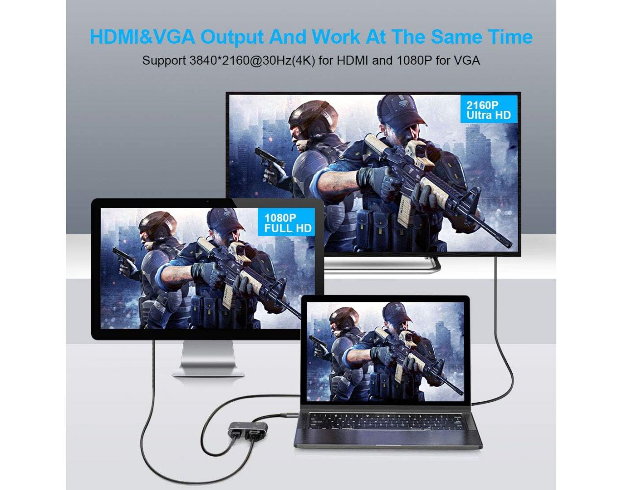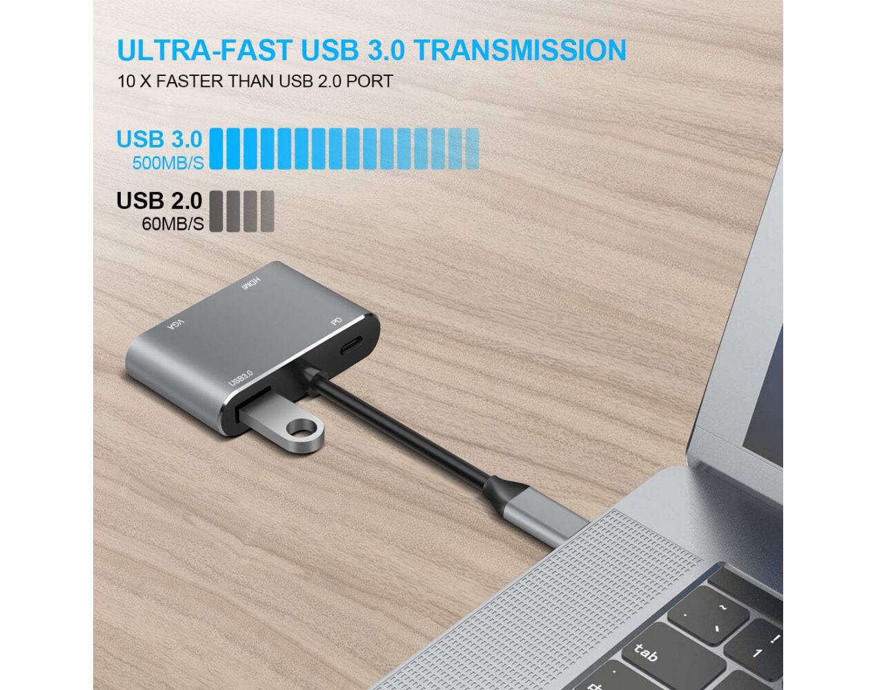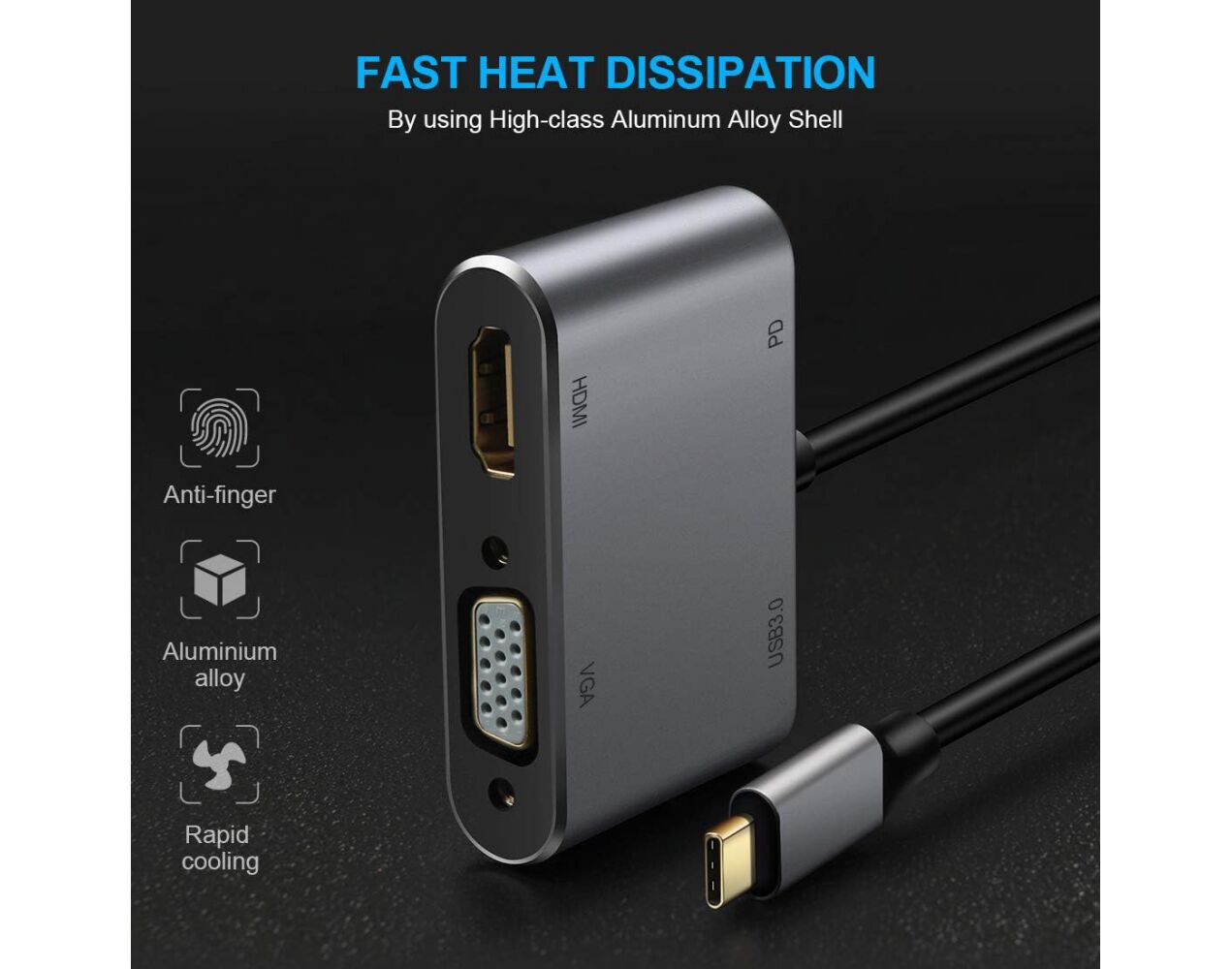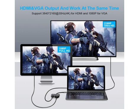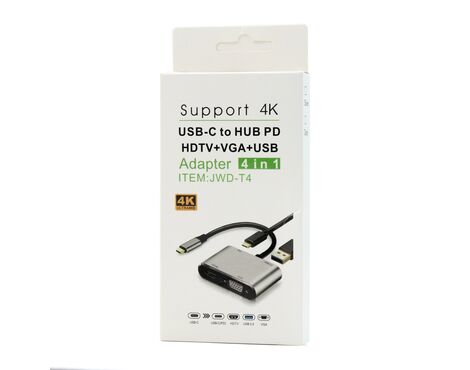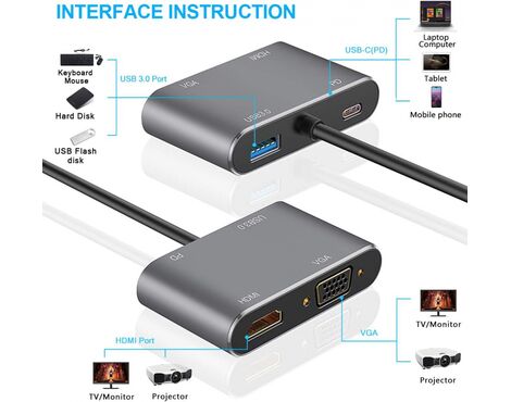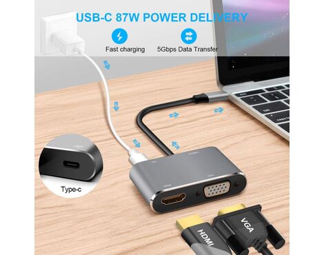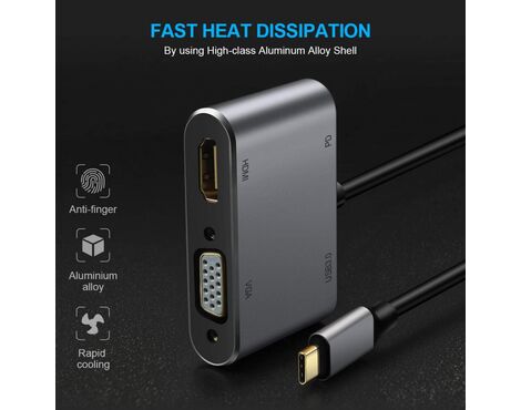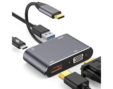 Adapter Type C na HDMI VGA PD USB3.0 4 u 1 sivi