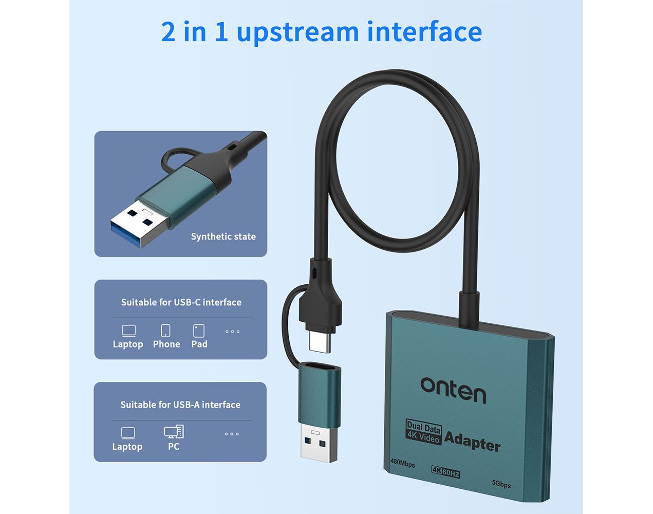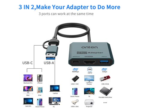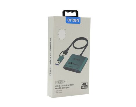 Adapter USB Flash 3u2 USB-A + USB Type-C na HDMI 4K 60Hz + USB 3.2 + USB Type-C 480Mbps 30cm (OTN-UCA303) Onten (MS)