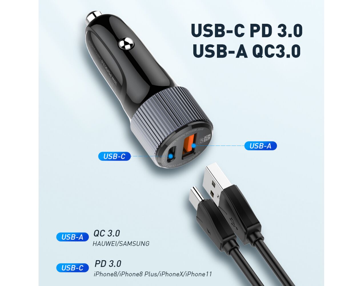 Auto punjac 30W USB-A + Type-C ulaz sa Type-C na Type-C kablom sivi (MS)