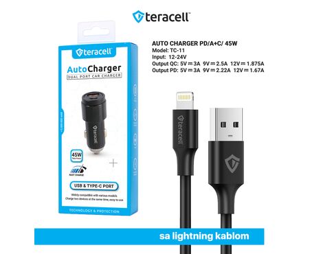 Auto punjac Teracell Evolution TC-11 PD 22.5W + USB QC3.0 20W, 45W (total) sa Lightning kablom crni