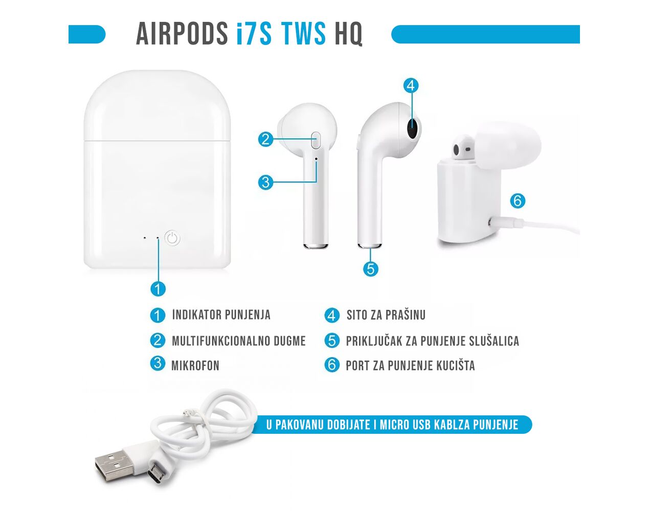 Bluetooth slusalice Airpods i7 mini bele HQ