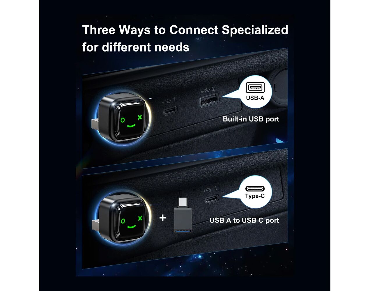 Uključuje USB-A i USB-C adaptere kako bi se osigurala kompatibilnost sa vec´inom USB portova u automobilima.