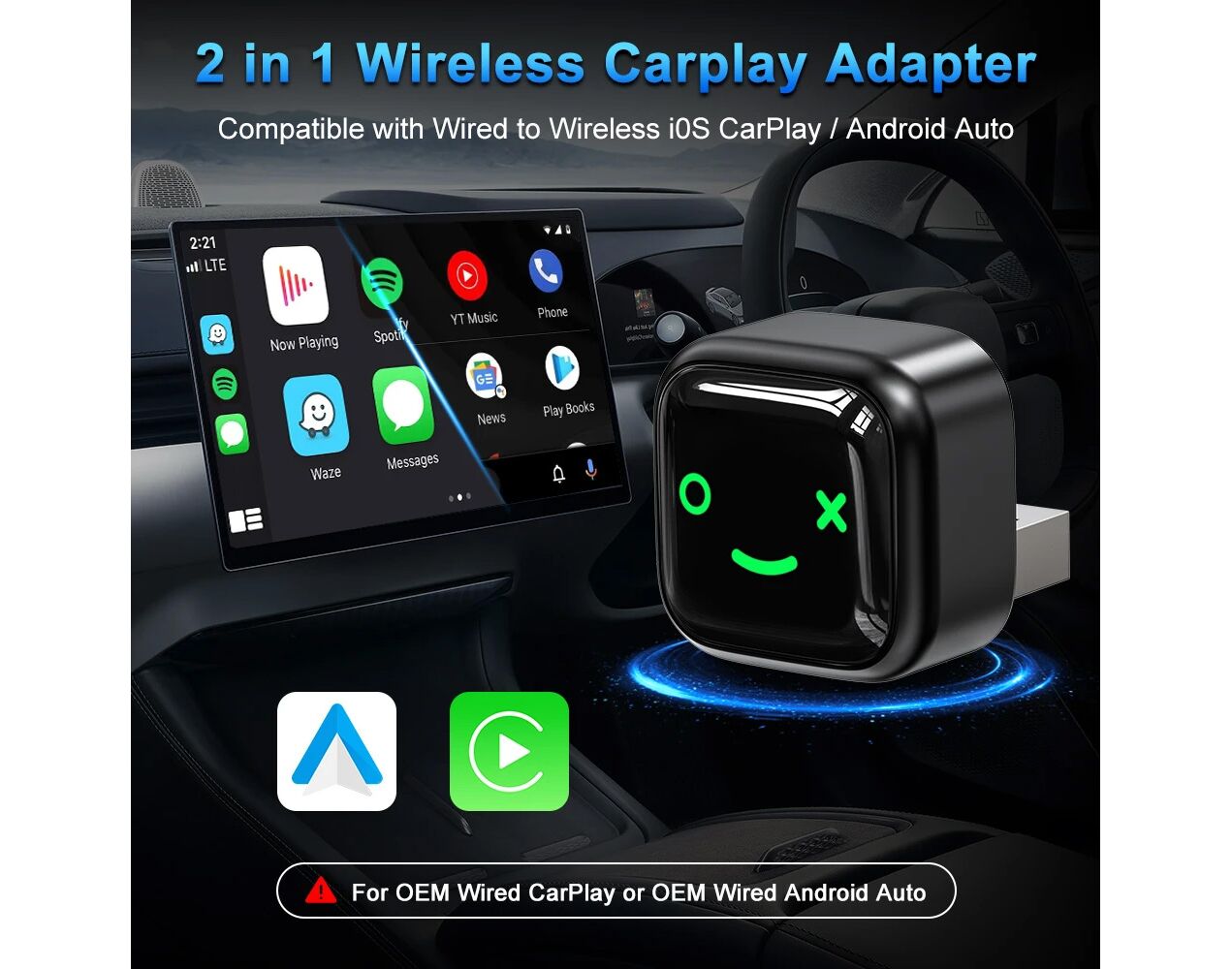 Nije kompatibilno sa vozilima koja vec´ ne podržavaju ožičeni CarPlay. Radi sa 98% fabrički instaliranih ožičenih CarPlay sistema. Podržava iPhone uređaje sa iOS 10 i novijim verzijama.