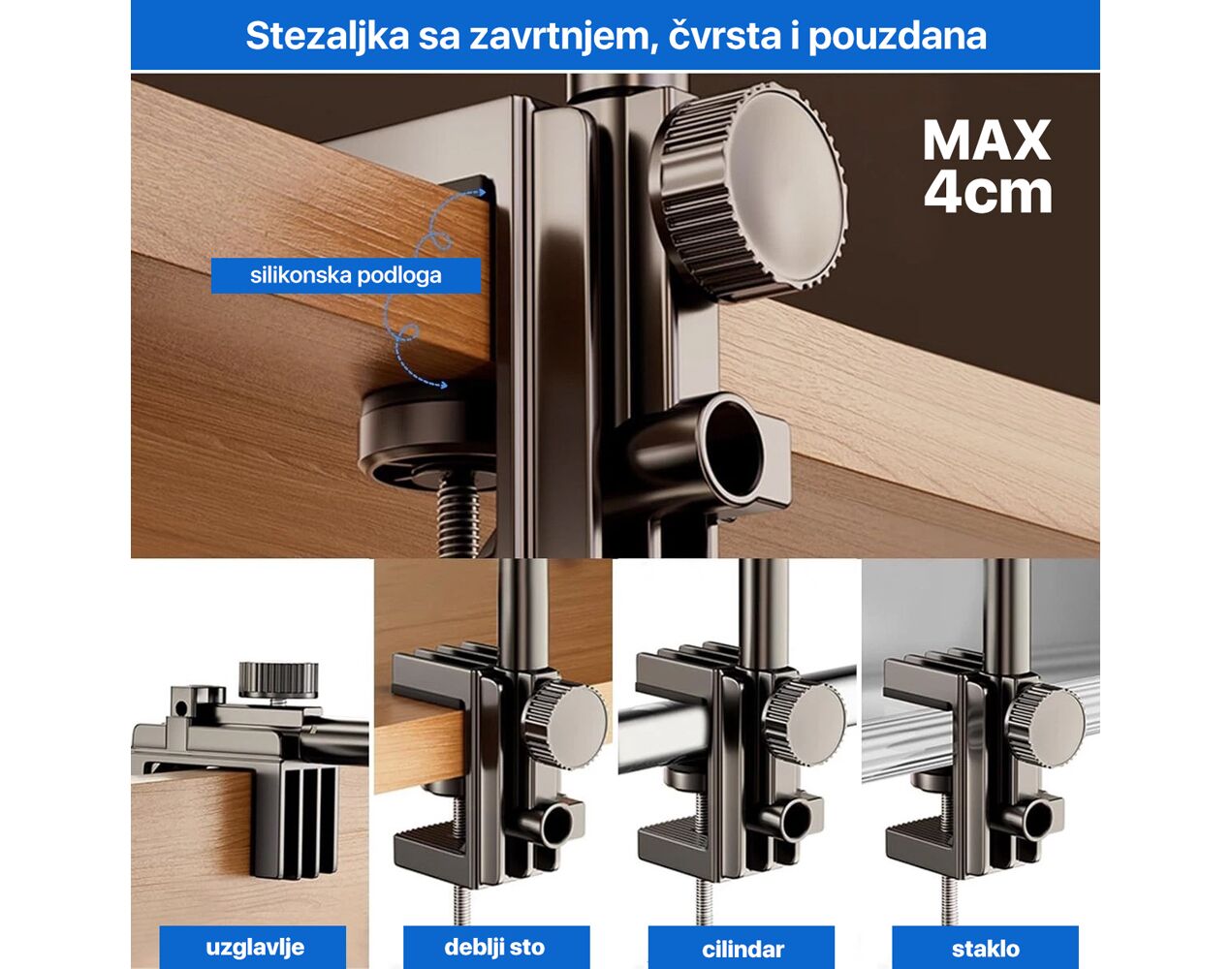 Držač je izrađen od kvalitetnog legiranog čelika, što ga čini izuzetno čvrstim, izdržljivim i stabilnim, čak i pri čestom savijanju. Možete ga pričvrstiti na radni sto, krevet, kuhinjski pult, stolice pa čak i u automobil, čineći ga univerzalnim dodatkom za svakodnevnu upotrebu.