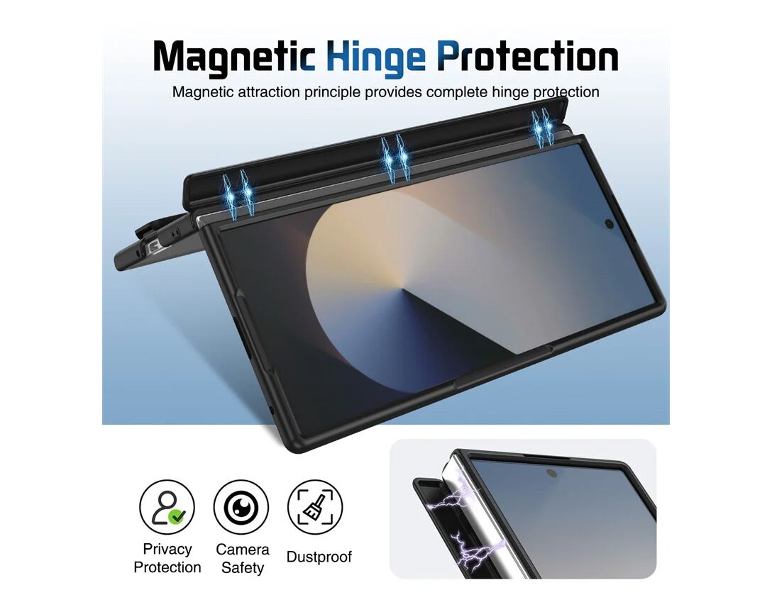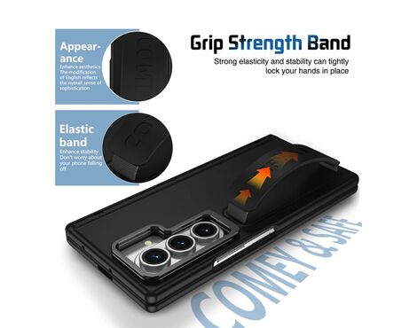 Elegantan spoj dizajna i zaštite — ova torbica je izrađena od kombinacije nežnog silikona, čvrste plastike i aluminijuma, pružajući odličnu otpornost uz prijatan osećaj u ruci. Prednji deo sadrži ugrađeno zaštitno staklo, dok masivna aluminijumska kamera-maskica ima magnetnu vezu i ujedno služi kao funkcionalan stalak. Na poleđini se nalazi i elastična traka u okviru ručke za sigurno držanje tokom korišćenja. Torbica u potpunosti pokriva i šarku telefona, čuvajući uređaj iz svih uglova bez kompromisa u praktičnosti.