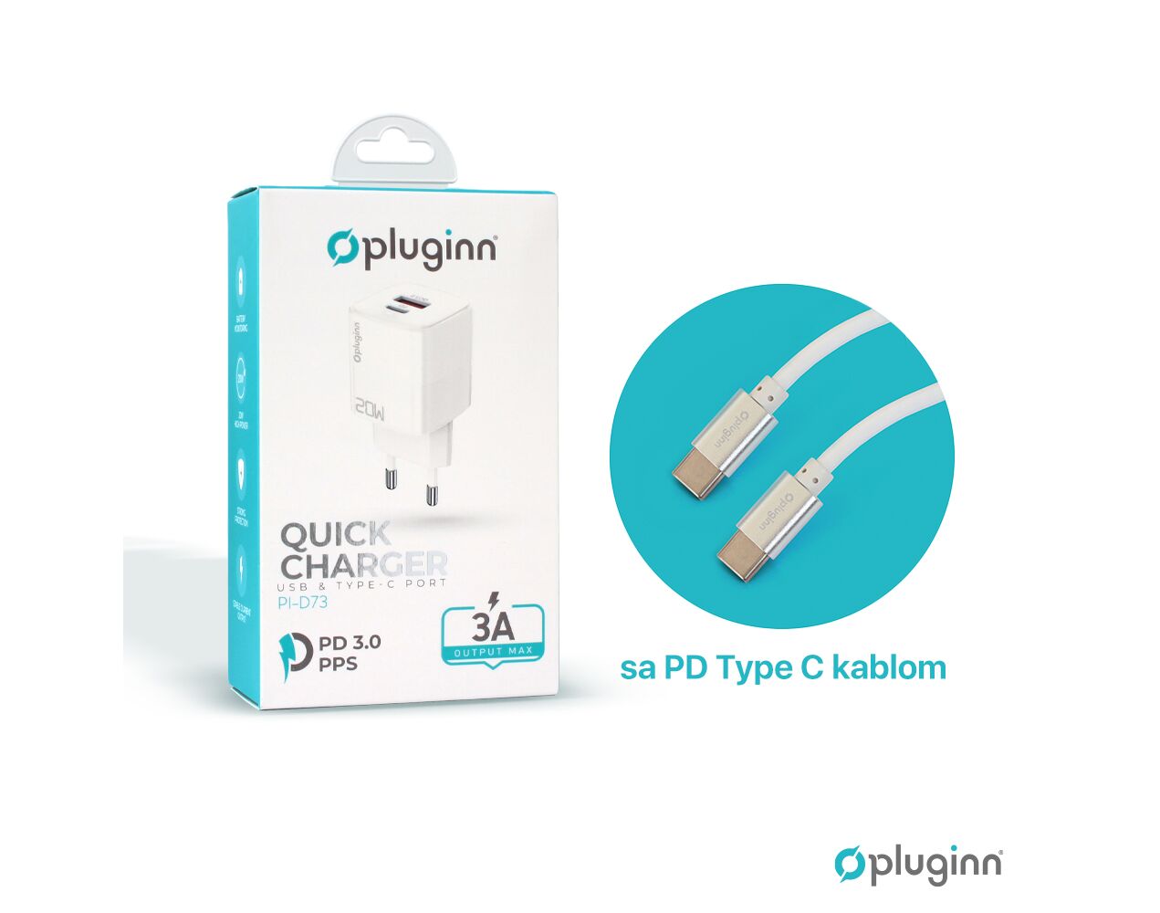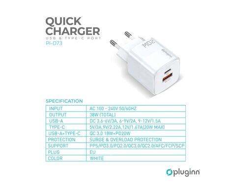 Kucni punjac Pluginn PI-D73, QC3.0 PD3.0, PPS, USB-PD 18W+20W, 38W (total) sa PD Type C kablom beli CE - Kućni punjač je sastavni deo svakodnevnog korišćenja mobilnog telefona. Od kvalitetnog punjača zavisi radni vek baterije, tako da će Vam ovaj punjač omogućiti brzo i kvalitetno punjenje. Kućni punjač za Kucni punjac Pluginn PI-D73, QC3.0 PD3.0, PPS, USB-PD 18W+20W, 38W (total) sa PD Type C kablom beli CE je atestiran, dolazi sa garancijom i vrhunskog je kvaliteta.