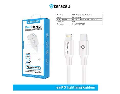 Kucni punjac Teracell Evolution TC-14GP, GaN, PD 3.0, 20W sa PD iPhone lightning kablom beli CE - Kućni punjač je sastavni deo svakodnevnog korišćenja mobilnog telefona. Od kvalitetnog punjača zavisi radni vek baterije, tako da će Vam ovaj punjač omogućiti brzo i kvalitetno punjenje. Kućni punjač za Kucni punjac Teracell Evolution TC-14GP, GaN, PD 3.0, 20W sa PD iPhone lightning kablom beli CE je atestiran, dolazi sa garancijom i vrhunskog je kvaliteta.
