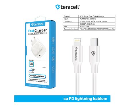 Kucni punjac Teracell Evolution TC-17GP, GaN, PPS, PD 3.0, 65W sa PD iPhone lightning kablom beli CE - Kućni punjač je sastavni deo svakodnevnog korišćenja mobilnog telefona. Od kvalitetnog punjača zavisi radni vek baterije, tako da će Vam ovaj punjač omogućiti brzo i kvalitetno punjenje. Kućni punjač za Kucni punjac Teracell Evolution TC-17GP, GaN, PPS, PD 3.0, 65W sa PD iPhone lightning kablom beli CE je atestiran, dolazi sa garancijom i vrhunskog je kvaliteta.