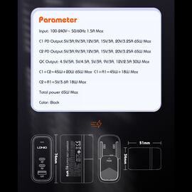 Kucni punjac sa adapterima LDNIO Q366 GaN QC3.0, 2xPD3.0 PPS 65W sa Type C na Type C kablom crni