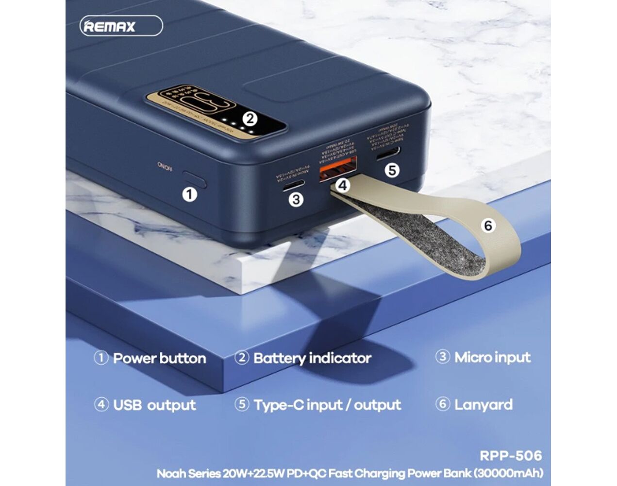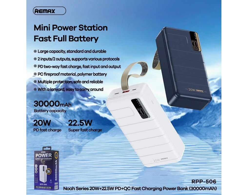 Univerzalna Back Up Baterija prenosiva baterija REMAX Noah Series RPP-506 PD QC 20W 22.5W 30000mAh plava