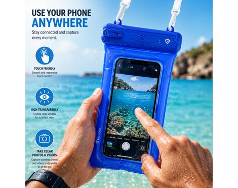 Uživajte bez brige na plaži, bazenu, moru ili snegu uz univerzalnu vodootpornu torbicu za telefon sa IPX8 sertifikatom. Dizajnirana da pruži maksimalnu zaštitu i funkcionalnost, ova torbica omogućava vam da koristite telefon u svim uslovima – bez straha od oštećenja.
